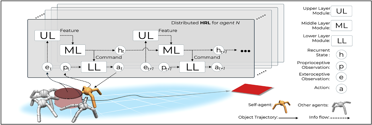Learning a Distributed Hierarchical Locomotion Controller for Embodied Cooperation